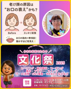 今回は、12日(金)第2部20:45~21:15のルームCです。 内容は、【老け顔はお口から始まる!?40代からの若見え講座】